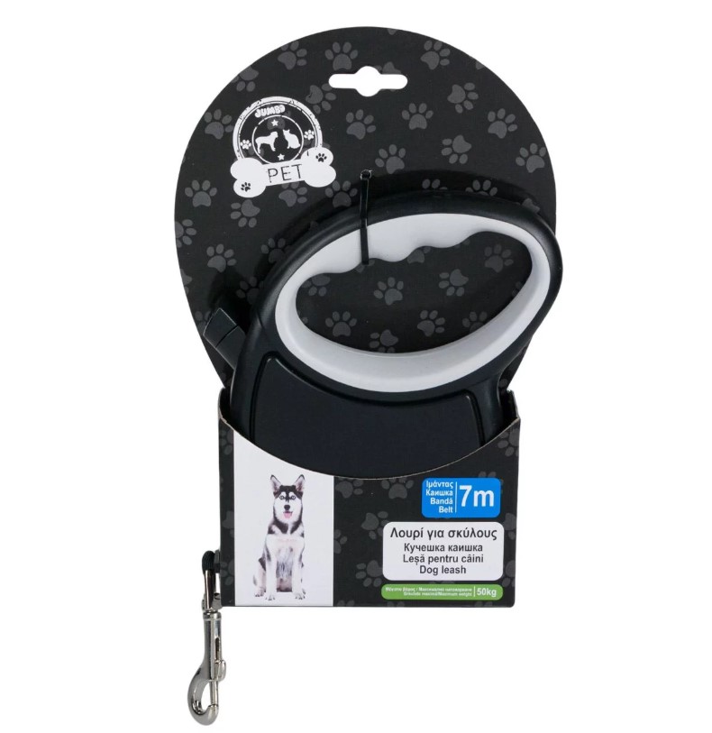 Curea mecanica pentru caini cu greutatea de 50 kg sau mai mult, cu buton de frana pentru a seta distanta animalului.Culoarea lesei este neagra, materialul poliester+plastic.