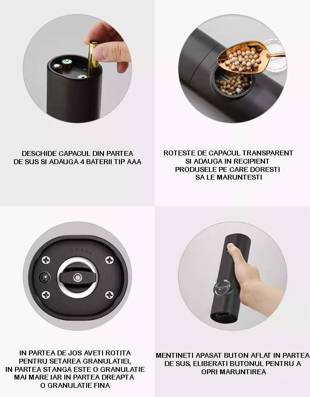 Setul de 2 rasnite electrice pentru sare/piper, condimente, este un accesoriu practic si usor de utilizat, care poate fi un cadou perfect pentru orice iubitor de bucatarie sau pentru oricine isi doreste sa aiba un accesoriu practic in bucatarie.